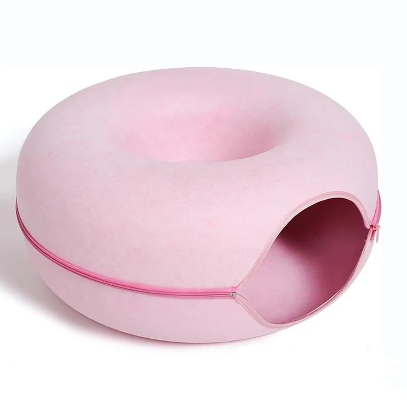 The donut cat cave is a durable, insulated, and waterproof play area for cats, made from felt fabric and designed in a fun donut style.