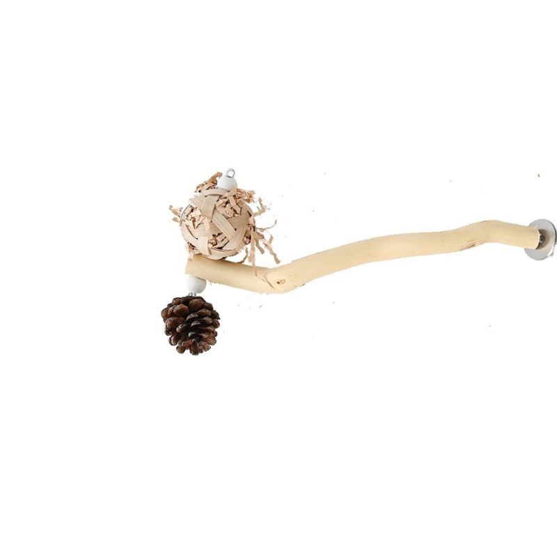 This product is made of a wooden frame, pine cones, and bamboo paper, simulating the shape of tree branches, for birds such as parrots to stand on.
